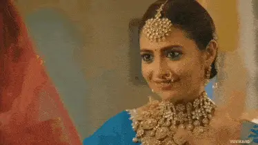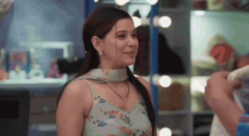 Shiva Pandya playfully holds up a garment for Raavi Pandya, who smiles and laughs in a dressing room.