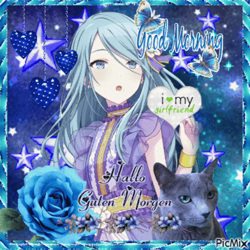 Shizuku Hinomori from Project Sekai in a "Good Morning" themed image with a cat and "I love my girlfriend" heart.