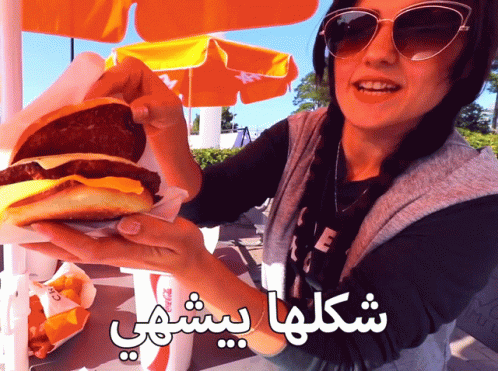 A woman holding a large, delicious-looking burger, with an orange umbrella in the background.