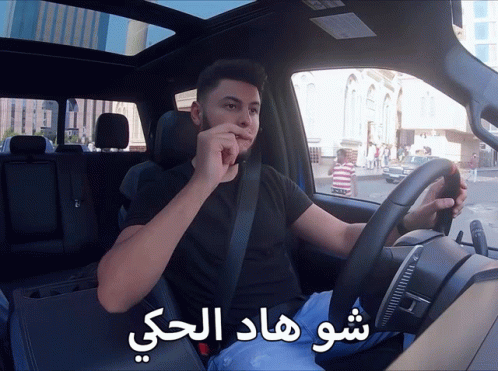 Man driving a car, reacting with a questioning or annoyed expression, with Arabic text "What is this talk?" on screen.