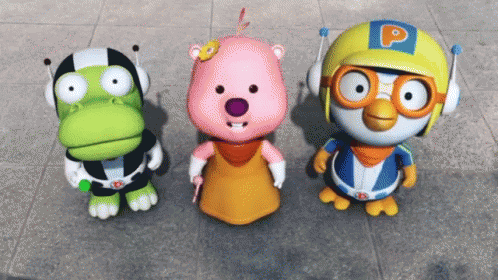 Pororo, Loopy, and Crong, the beloved animated characters, appear shocked and surprised, eyes wide open.