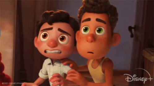 Luca Paguro and Alberto Scorfano look shocked, with Luca appearing particularly scared in this Disney/Pixar scene.