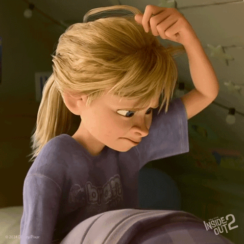 Riley Anderson from Inside Out 2 reacts with a shocked expression, scratching her head in confusion.