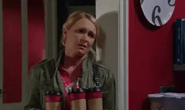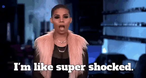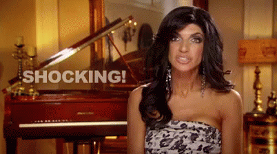 Teresa Giudice from Real Housewives reacts with a 'SHOCKING!' expression in a living room.