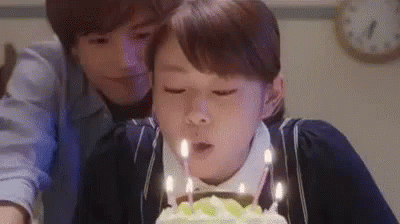 A woman blows out candles on a birthday cake as a man watches, from 'Shokubutsu Zukan'.
