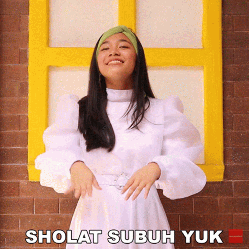 Keyne Stars encourages viewers to perform Fajr prayer, standing in a white dress against a yellow window.