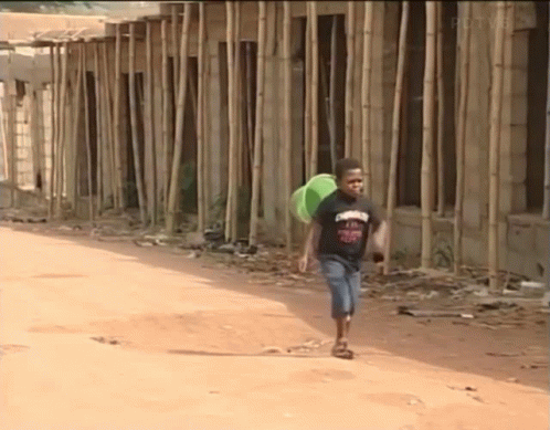 Osita Iheme, a young boy, walks down a dirt road, looking 'shook' and 'unlooking'.