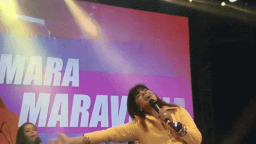 Mara Maravilha performs live at the 'Canto Pela Paz' show, singing into a microphone on stage.