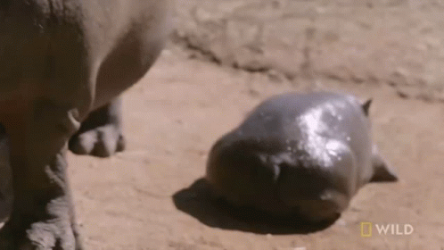 A newborn hippo calf gets rehydrated on the ground, observed by an adult hippo, from National Geographic.