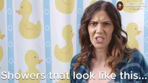 A woman reacts to disgusting shower conditions, including spilled blue body wash and a hairy bar of soap.