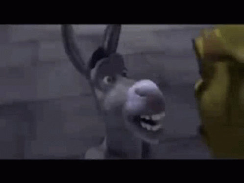 Shrek and Donkey in a dark room, with Donkey talking to Shrek, saying "HAY QUE ENTRAR A VER".