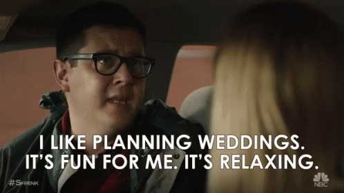 A man in glasses in a car expresses his enjoyment for planning weddings, finding it fun and relaxing.