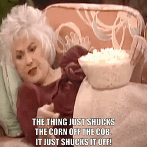 A Golden Girls character relaxing on a sofa with popcorn, discussing shucking corn.