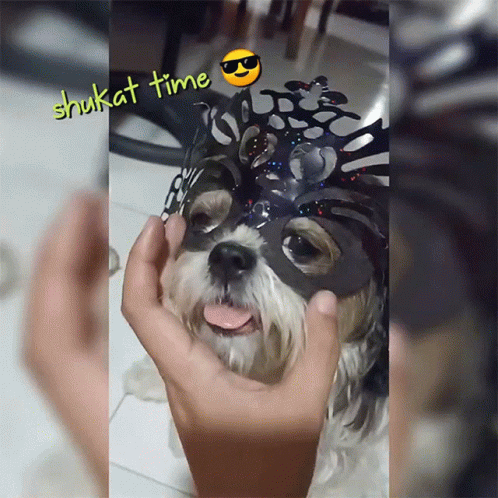 Doratzu, an adorable Shih Tzu, wears a decorative mask with its tongue playfully sticking out during 'Shukat Time'.