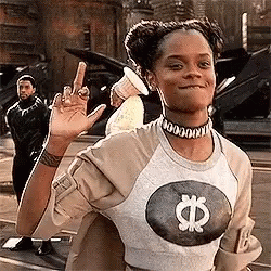Shuri gives a playful middle finger gesture while T'Challa stands in the background.