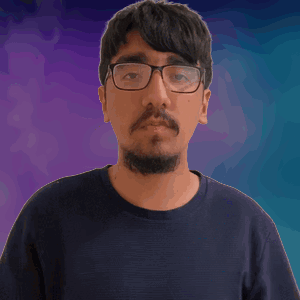 a man with glasses and a beard is clapping his hands in front of a purple background