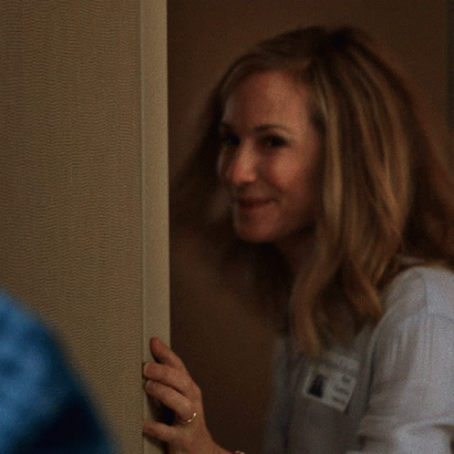 Holly Hunter as Beth Gardner from The Big Sick, shyly peeking from behind a door with a smile.