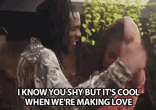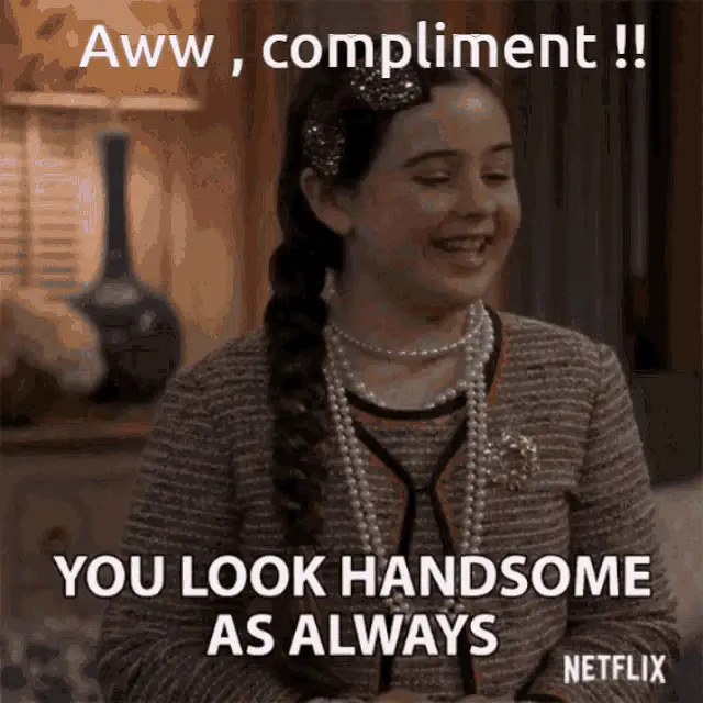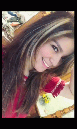 A pretty girl with long, highlighted hair, wearing a red shirt, smiling shyly at the camera.