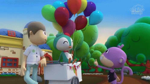 El Reino Infantil characters, a man, a monkey, and a bird, gather around a cart filled with colorful balloons.