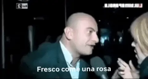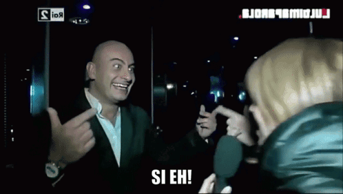 A bald man excitedly says 'Si Eh!' to a woman with a microphone in a discoteca, a popular Italian meme.