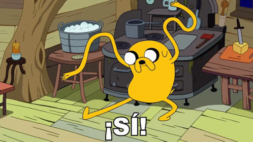 Jake from Adventure Time dances excitedly in a rustic kitchen, exclaiming "YES!" with enthusiasm.