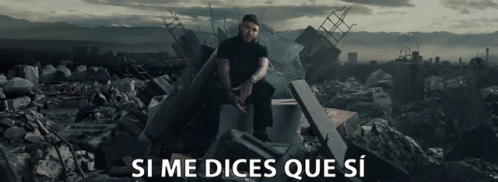 Farruko in a post-apocalyptic setting, with the Spanish lyrics 'Si Me Dices Que Sí, Te Compro Richard Millie' appearing on screen.
