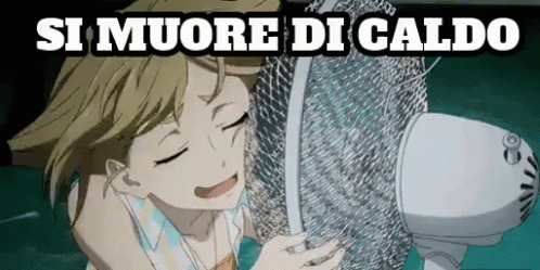 Anime girl suffering from extreme heat, using a fan to cool down during a hot summer.