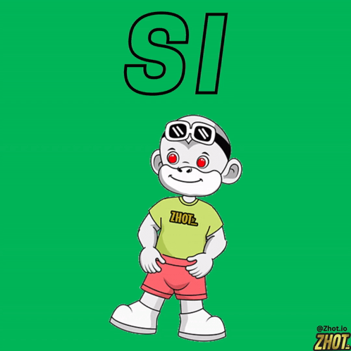 Cartoon monkey with red eyes and sunglasses dances on a green background with 'SI' text.
