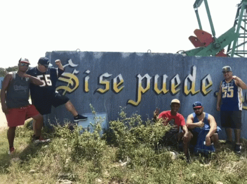 A group of men pose for a photo in front of a large sign that reads 'Si se puede'.