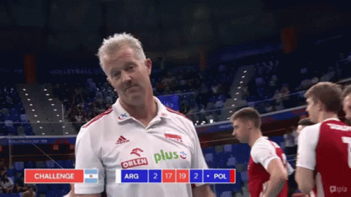 Volleyball coach Vital Heynen reacts to a challenge call during a match between Argentina and Poland.