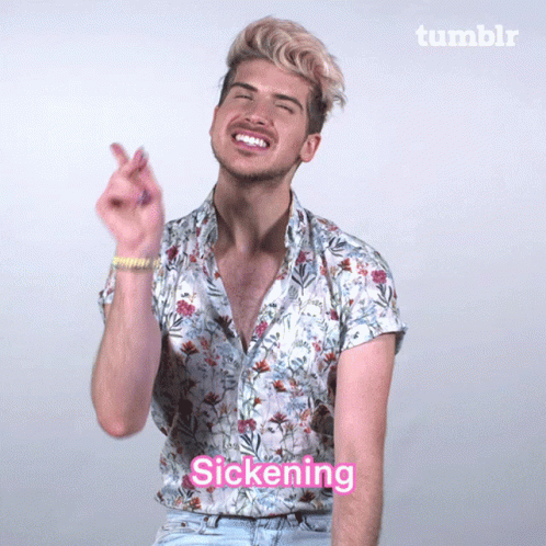 A man with bleached blonde hair and a floral shirt reacts playfully with the on-screen caption 'Sickening'.
