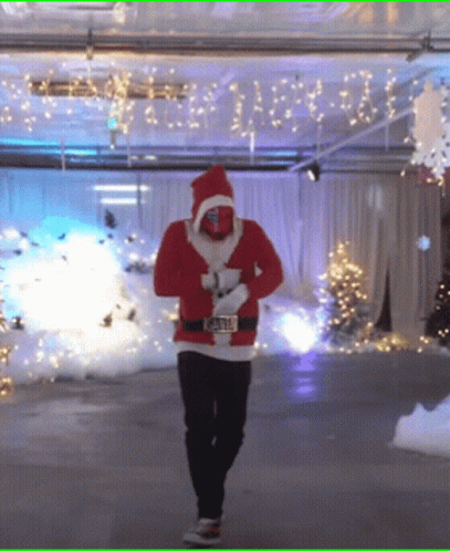 Sickixk in a Santa suit dancing energetically in a room decorated with Christmas lights and snow.