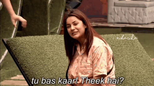 Shehnaaz Gill from Bigg Boss 13, sitting on a lawn, says 'Tu bas kar! Theek hai?' with a smile.