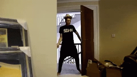 Miniminter from Sidemen dances playfully in a room, wearing an SDMN shirt and a small hat.