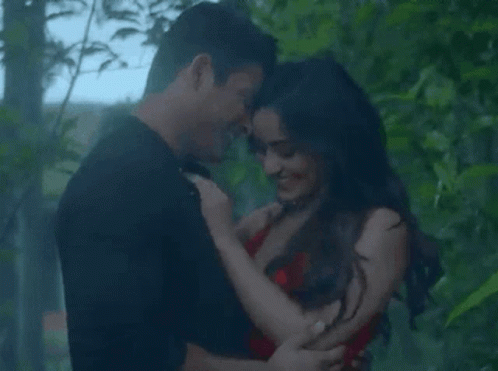 Sidharth Shukla and Neha Sharma share a romantic embrace in a lush, green setting.