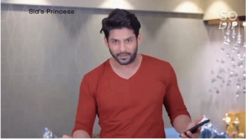 Sidharth Shukla in a red shirt, surrounded by sparkling hearts, with the text 'Mai Hu Na' appearing.