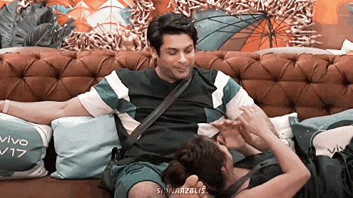 Shehnaaz Gill and Sidharth Shukla share sweet moments on a couch, with Shehnaaz playfully interacting with Sidharth.