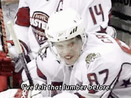 Sidney Crosby smiles and says 'I've felt that lumber before' during a hockey game, wearing his white jersey.