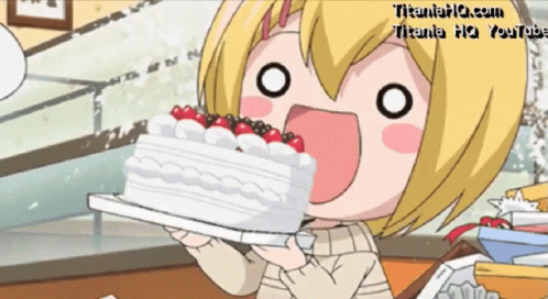 Anime girl with blonde hair enthusiastically eats a large slice of white cake with a strawberry.
