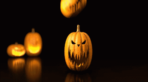 A pumpkin dramatically smashes into pieces on a dark surface, with glowing carved pumpkins in the background, setting a spooky Halloween scene.