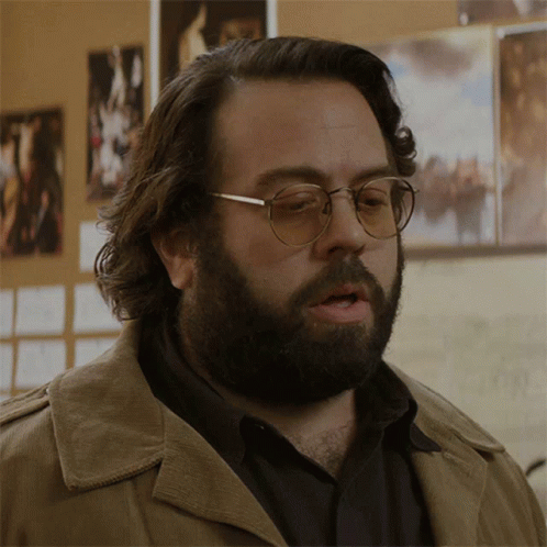 Dan Fogler, portraying Francis Ford Coppola, sighs with a look of disappointment, wearing glasses and a tan jacket.
