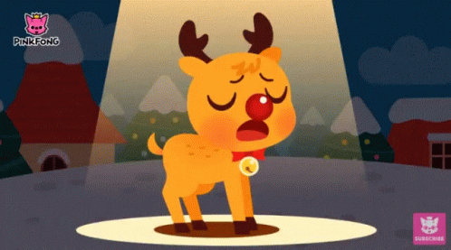 Pinkfong's Rudolph the Red-Nosed Reindeer looks sad and stressed, sighing under a spotlight.