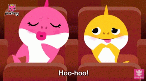 Pinkfong's Baby Shark and Mommy Shark sighing and saying 'Hoo-hoo!' in a theater.