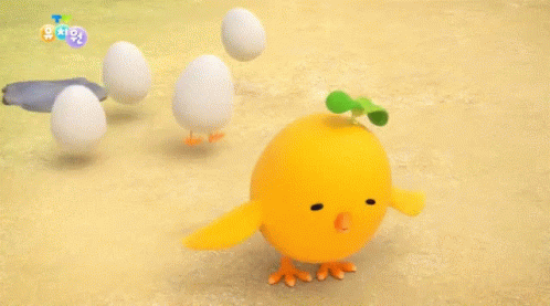 A cute yellow chick with a green sprout on its head sighs sadly, surrounded by eggs in a kindergarten setting.