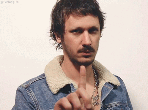 Daniel Furlan makes a 'shush' gesture, putting his finger to his lips, wearing a denim jacket.
