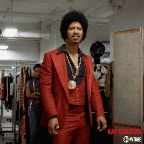 Ray Donovan actor in a red suit and afro wig, striking a silly, goofy pose for Showtime promo.