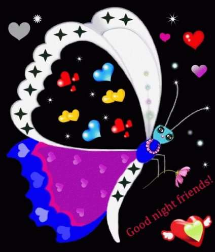 Silviane Moon's colorful butterfly graphic with hearts and a 'Good night friends!' message.