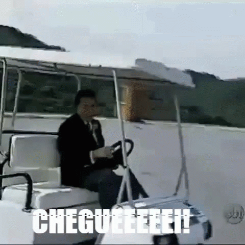 Silvio Santos Abravanel makes a grand entrance in a golf cart, exclaiming 'I arrived!' with his characteristic flair.