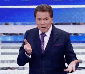 Brazilian TV icon Silvio Santos performs his characteristic "dancinha," gesturing expressively on stage in a suit and tie.