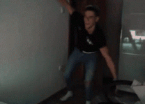 Simi Simisfws dancing energetically in a room, possibly from a stream, performing moves to Bidibao.